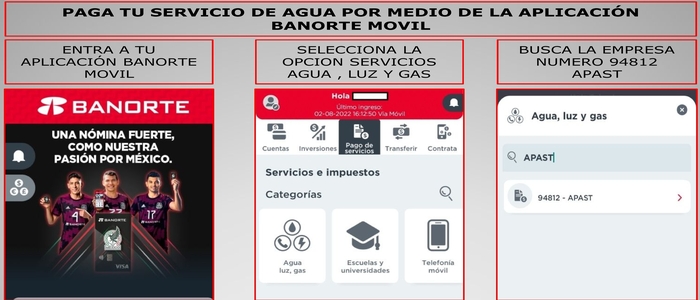 AHORA YA PUEDES PAGAR TU SERVICIO DE AGUA DESDE TU CELULAR SOLO TIENES QUE INGRESAR A LA APLICACIÓN DE BANORTE Y SEGUIR  LOS PASOS DESCRITOS EN LA IMAGEN DE APOYO